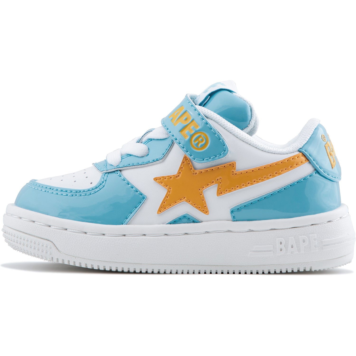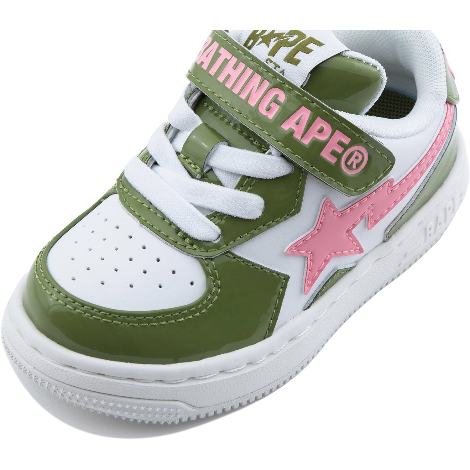 The BAPE STA ICON KIDS #1 shoes come in three bright colors perfect for summer. Choose from olive green with pink. sky blue with orange. or two shades of gray. These shoes add a fun. stylish touch to any outfit while showing off your unique style.