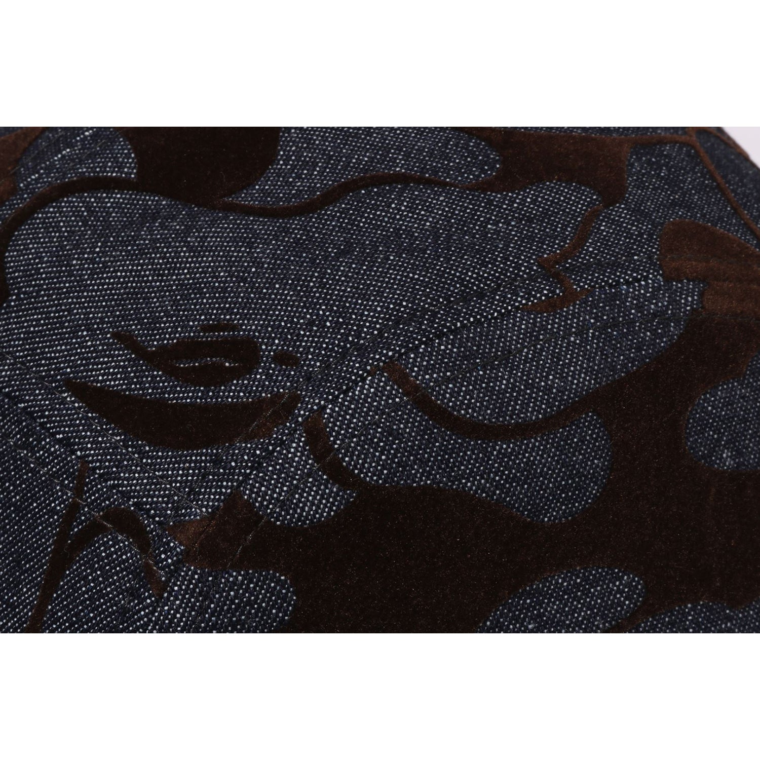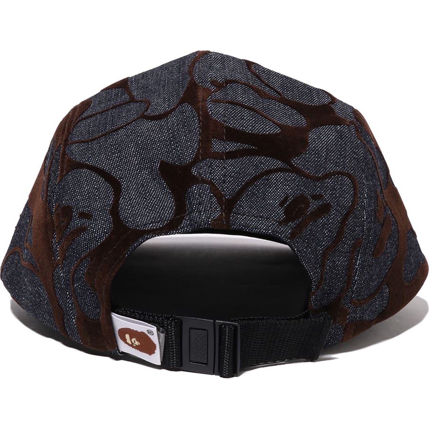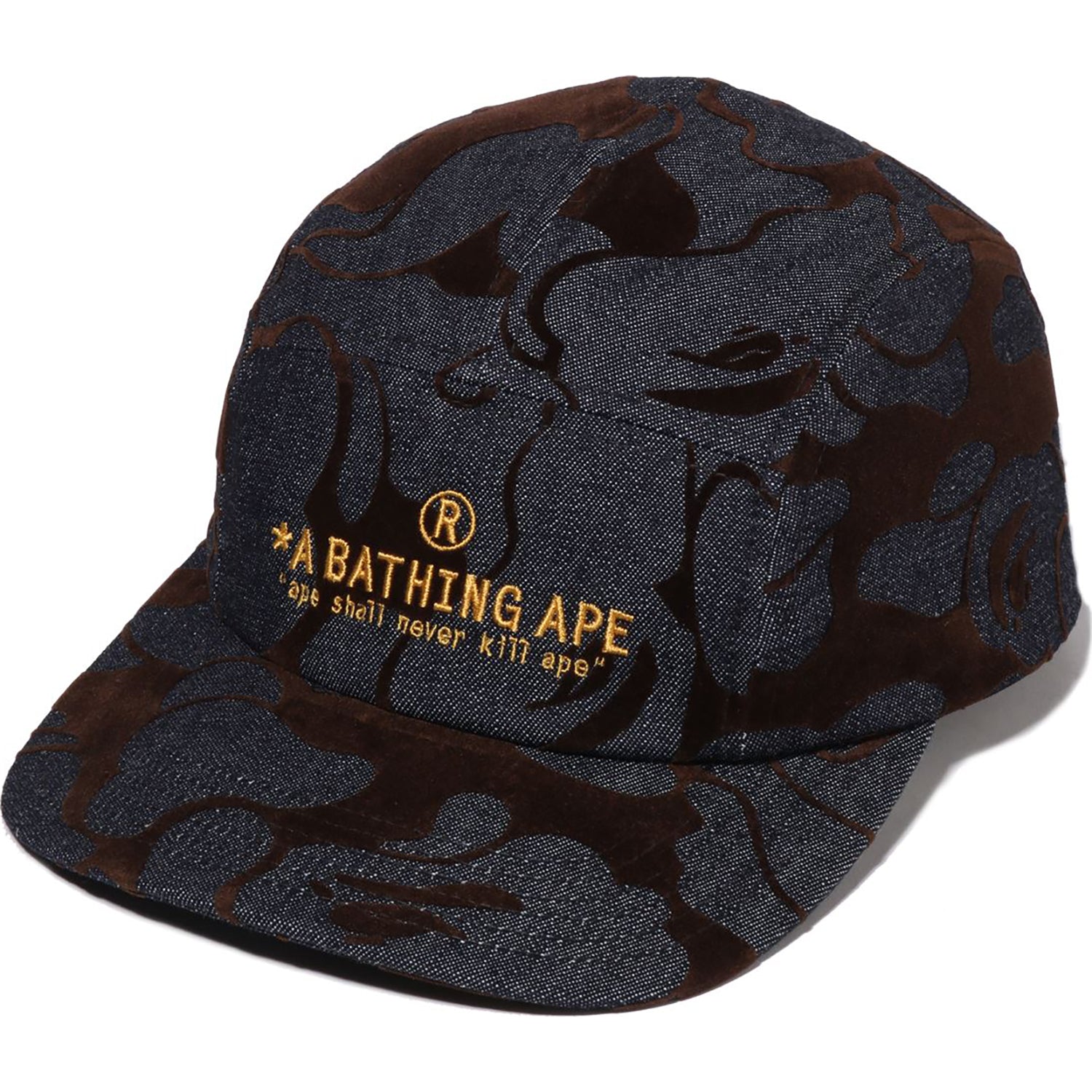 This denim jet cap showcases a flocked solid camo design and includes an embroidered A BATHING APE logo. combining style with quality craftsmanship.