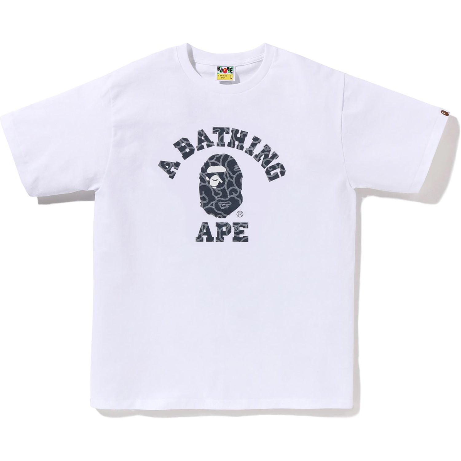 BAPE MENS COTTON JAPANESE CLOUD CAMO COLLEGE T-SHIRT showcases a large BIG APE HEAD graphic in a distinctive JAPANESE CLOUD CAMO design printed on denim both front and back. Its regular fit makes it versatile enough to wear alone or layered for added style and comfort.